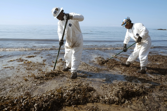 Workers in protective suits raked and shoveled stinky black goo off the beaches, while boats towed booms into place to corral the two slicks off the Santa Barbara coast, where a much larger spill in 1969 — the largest in U.S. waters at the time — is credited with giving rise to the American environmental movement.