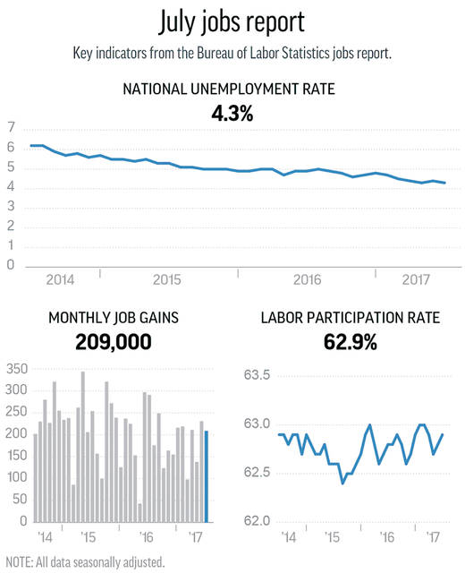 Yet Friday’s jobs report suggests such concerns are premature. Employers added 209,000 jobs, after a solid gain of 231,000 in June, the Labor Department said. The unemployment rate ticked down to 4.3 percent, from 4.4 percent, matching the low reached in May.