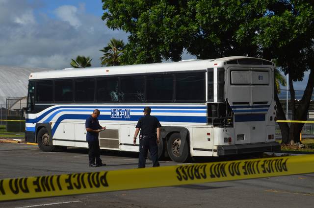 Police and crime lab evidence technicians surveyed damage to the bus and were processing it for evidence Monday morning in the parking lot of the county’s Sparky Kawamoto Aquatic Complex in the Hoolulu facility.