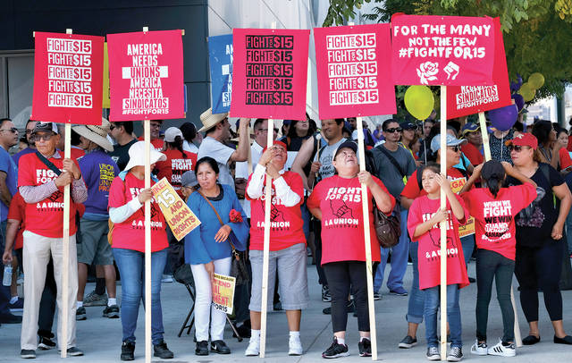 Hundreds of people marched through downtown Los Angeles on Monday, calling for a $15-an-hour minimum wage nationwide and stronger union protection for workers.