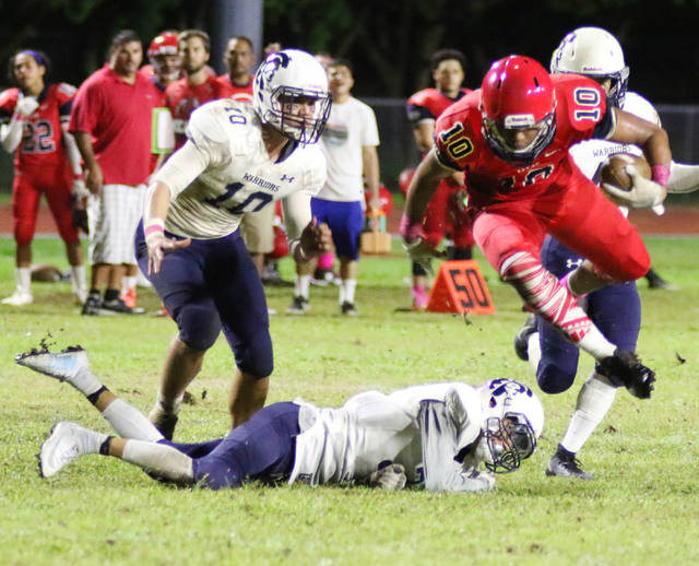 Waiakea did enjoy one of its best drives of the season with an 85-yard touchdown march in the first half in which the Warriors converted two fourth downs. One came on a fake punt and the other was a 29-yard pass play from Noah Eblacas to Daryl Sampaga that paved the way for Cody Alvaro-Thomas’ 6-yard scoring run.