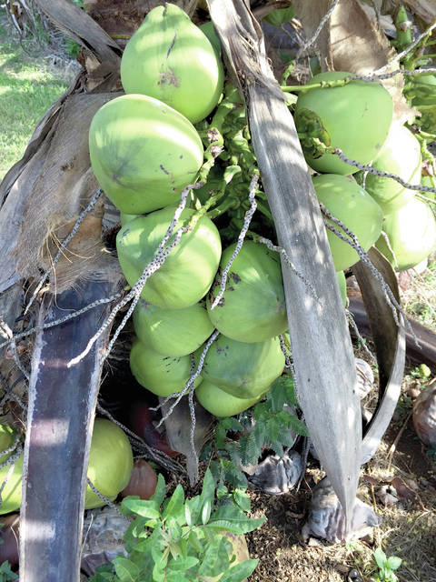 Getting back to the coconut palm, it makes a great tree for the Hawaiian garden. The dwarf Samoan form is the best and available at some local nurseries. The tree will start producing fruit when young and can be easily harvested at near ground level for years.