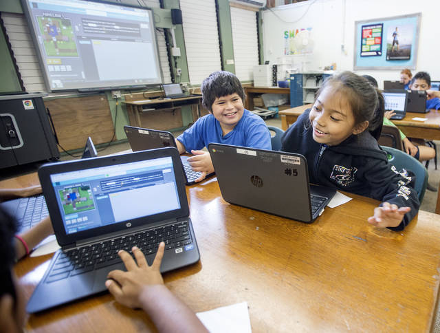 HOLLYN JOHNSON/Tribune-Herald Third-graders Madyson Galima, 8, and Isaiah Mahi, 8, laugh with their classmates as they learn how to code using a Minecraft program Thursday at Chiefess Kapi‘olani Elementary School in Hilo.