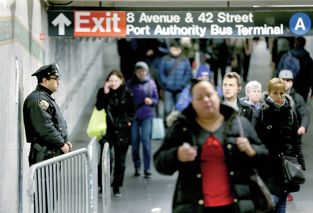 A police officer stands in the passageway connecting New York City's Port Authority bus terminal and the Times Square subway station Tuesday, Dec. 12, 2017, near the site of Monday's explosion. Commuters returning to New York City's subway system on Tuesday were met with heightened security a day after a would-be suicide bomber's rush-hour blast failed to cause the bloodshed he intended. (AP Photo/Seth Wenig)
