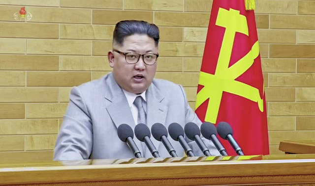 KRT via AP Video In this image made from video released Monday, North Korean leader Kim Jong Un gives his annual address at an undisclosed location in North Korea.