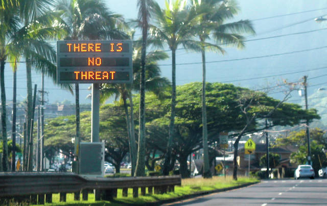 Associated Press A highway median sign broadcasts a message of “There is no threat” on Saturday in Kaneohe, Oahu. State emergency officials mistakenly sent out an emergency alert warning of an imminent missile strike, sending islanders into a panic.