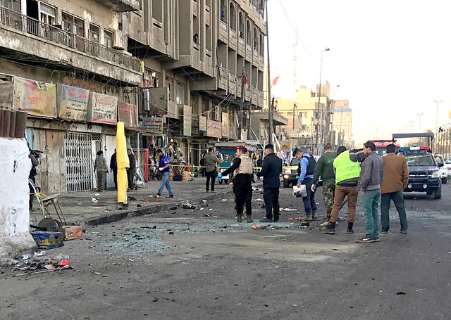 Iraqi security forces gather at the scene of a double suicide bombing in Baghdad, Iraq, Monday, Jan. 15, 2018. Interior Ministry spokesman said a double suicide bombing in central Baghdad has killed and wounded civilians. (AP Photo/Ali Abdul Hassan)