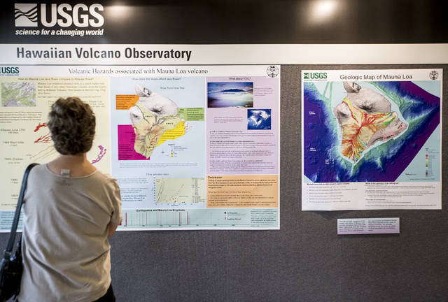 A guest looks at information about the volcanic hazards associated with Mauna Loa volcano from U.S. Geological Survey on Saturday during “Mauna Loa: Let’s Talk Story,” a 2018 Volcano Awareness Month community program at the University of Hawaii at Hilo. The free event will be presented again from noon-3 p.m. Jan. 27 in the Konawaena Elementary School cafeteria. In addition, the Hawaii Island Realtors and Hawaii Island Chamber of Commerce will present “Mauna Loa: What We Need to Know” during a joint luncheon meeting from 11:30 a.m.-1 p.m. Feb. 7 at ‘Imiloa Astronomy Center’s Moanahoku Hall. The cost is $30 for HIR and HICC members and employees, $35 for all others. Preregistration is required by Jan. 31 to the HICC office. For more information, call 935-7178 or email admin@hicc.biz.
