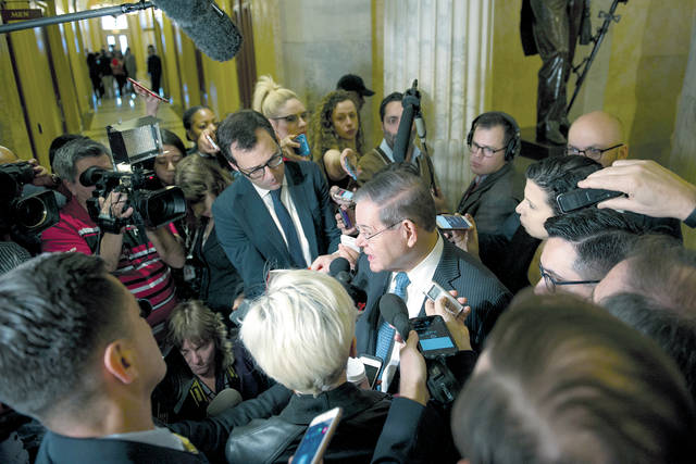 Sen. Robert Menedez, D-N.J., speaks with reporters after attending a Congressional Hispanic Caucus meeting with White House Chief of Staff John Kelly on Capitol Hill in Washington, Wednesday, Jan. 17, 2018. (AP Photo/Cliff Owen)
