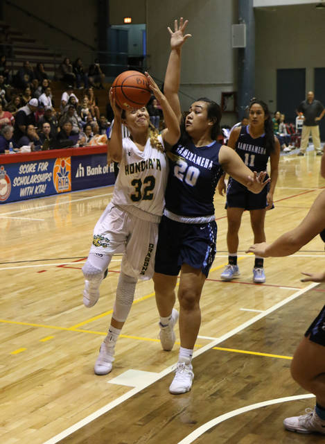 Honokaa’s Aulani Cordero knocked down a 3-ball right before the buzzer in the first quarter. Pacheco returned the favor with a layup at the buzzer in the second period.