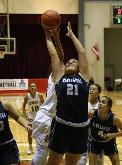Honokaa's Kavia Branco drives in for a shot during last night's DII game against Kamehameha. Photo: Tim Wright