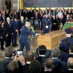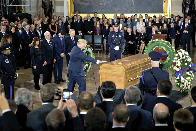 As the leaders stood by the casket, Trump reached out to touch it. Ryan, nearby, bowed his head.