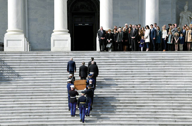 The family of Rev. Billy Graham watches as the casket of Rev. Billy Graham is carried up the steps of the U.S. Capitol in Washington, Wednesday, Feb. 28, 2018, where it will lie in honor in the Rotunda. It’s a rare honor for a private citizen to lie in honor at the Capitol. Graham died Wednesday in his sleep at his North Carolina home. He was 99. (AP Photo/Susan Walsh, Pool)