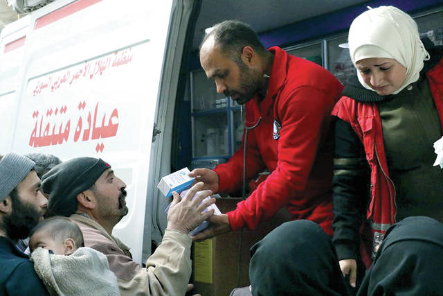 This photo release by the Syrian Red Crescent, shows members of the Syrian Red Crescent distributing medicines for civilians in Douma, eastern Ghouta, a suburb of Damascus, Syria, Monday, March. 5, 2018. Desperate for food and medicine, Syrian civilians in the war-ravaged eastern suburbs of Damascus hoped for relief Monday as a 46-truck aid convoy began entering the rebel stronghold, the first such shipment in months. (Syrian Red Crescent via AP)