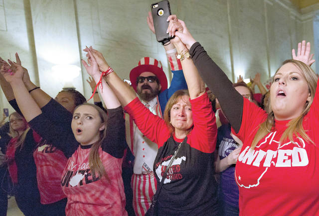 Teachers and school personnel celebrate after the state Senate approved a bill to increase state employee pay by 5 percent at the capitol in Charleston, W.Va., on Tuesday, March 6, 2018. The lawmakers unanimously approved the pay raises for teachers and troopers, after the governor reached a deal to end a teacher walkout that shuttered the state’s schools for nine days. (Craig Hudson/Charleston Gazette-Mail via AP)