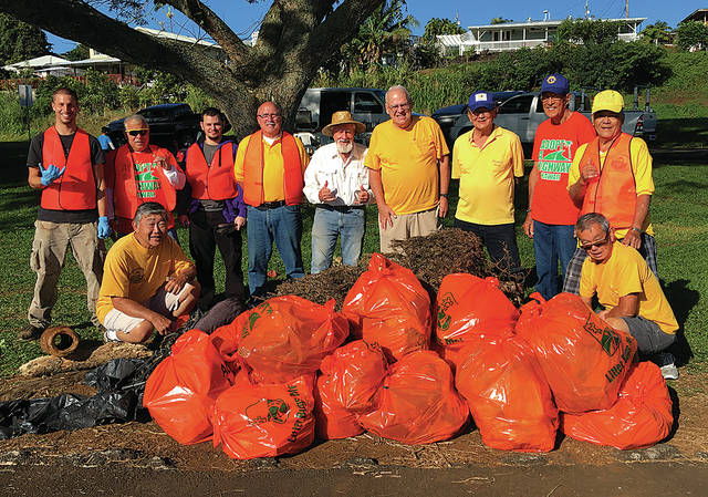 Waiakea Lions Club members at the Hilo Bay lookout gather around trash they recently collected along Highway 19 between the Wailuku River Bridge and the Honolii Stream Bridge. For the past 26 years, the Waiakea Lions Club has kept the area clear of litter and debris. Members said the service project reflects the club’s pride for the community.