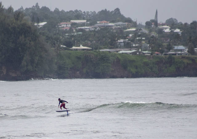 HOLLYN JOHNSON/Tribune-Herald A surfer rides waves on a hydrofoil board Tuesday at Hilo Bayfront.