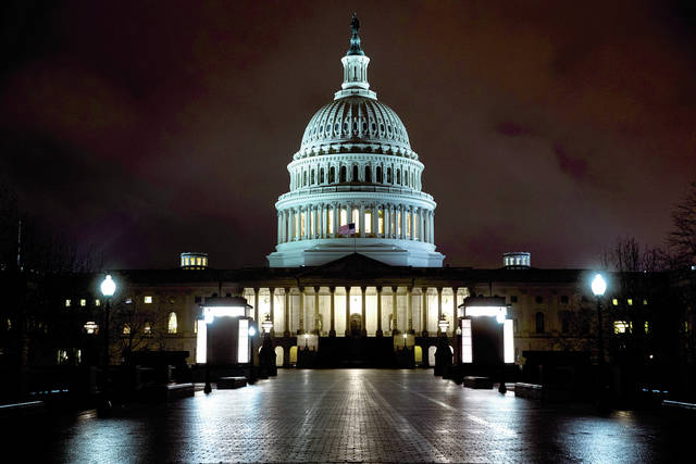 The Capitol is seen before dawn Wednesday after a night of negotiating on the government spending bill, in Washington, March 21, 2018. Talks over a $1.3 trillion omnibus bill are almost complete as the White House and Capitol Hill Democrats ironed out deals on a first round of funding for President Donald Trump’s U.S.-Mexico border wall. (AP Photo/J. Scott Applewhite)