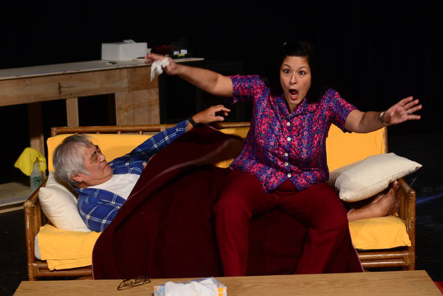 Photo by Daniel Nathaniel Houekeeper Grace (Kelly Rae Aguiar) is surprised to discover Wally (Jon Sakurai Horita) sleeping on his couch.