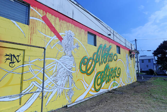 The mural, painted on the west-facing wall of Agasa Furniture on Ponahawai Street, features two hula dancers flanking the words “Aloha Aina.” Although one of the dancers’ arms is now partially obscured by a large red bar, the dancer originally was depicted brandishing an AK-47 assault rifle.