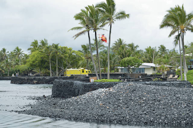 MICHAEL BRESTOVANSKY/Tribune-Herald A Hawaii Fire Department helicopter comes in for a landing at a private vacation house in Kapoho for refueling.