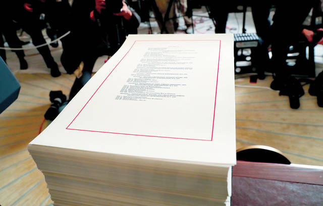 FILE - In this March 23, 2018, file photo, a copy of the $1.3 trillion spending bill is stacked on a table in the Diplomatic Room of the White House in Washington. A new analysis says President Donald Trump's tax cuts and last month's big spending bill will send the federal deficit toward $1 trillion. The Congressional Budget Office says tax and spending bills will push the deficit to $804 billion this year and nearly $1 trillion for 2019. (AP Photo/Pablo Martinez Monsivais)