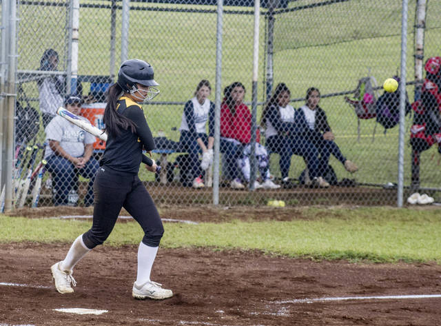 HOLLYN JOHNSON/Tribune-Herald Kohala’s Cheylin Imai hits a ball in March at Waiakea. On Saturday, the Cowgirls host Konawaena in an 11 a.m. doubleheader in a best-of-three D-II semifinal.