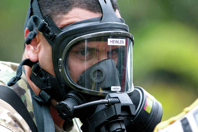 First Lt. Aaron Hew Len, of the U.S. National Guard, tests air quality near cracks emitting toxic gases from the eruption in Leilani Estates on Tuesday. Scientists confirm that volcanic activity has paused at all 12 fissures that opened up in a Hawaii community and oozed lava that burned 35 structures. Officials warn that hazardous fumes continue to be released from the cracks in the ground. (AP Photo/Caleb Jones)