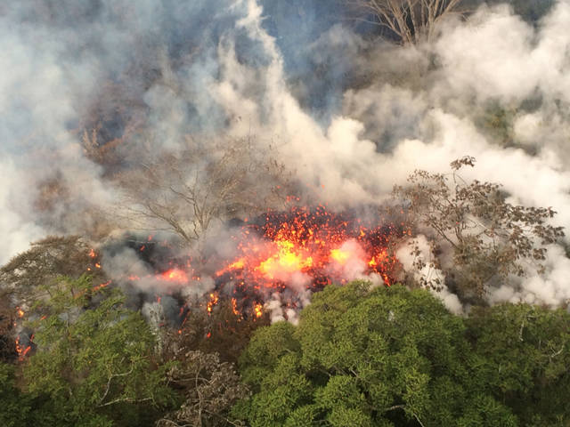 This image provided by the U.S. Geological Survey shows lava spattering Wednesday in Puna. Airbnb has instituted its Disaster Response Program, asking Big Island hosts to open their doors to victims of the disaster as well as relief workers.