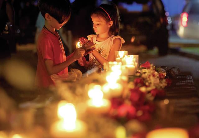 Stuart Villanueva/The Galveston County Daily News via AP Lucrecia Martinez, 7, and her brother, Luciano, 9, of Dickinson light candles during a vigil Friday hosted in the wake of a deadly school shooting at Santa Fe High School in Santa Fe, Texas.