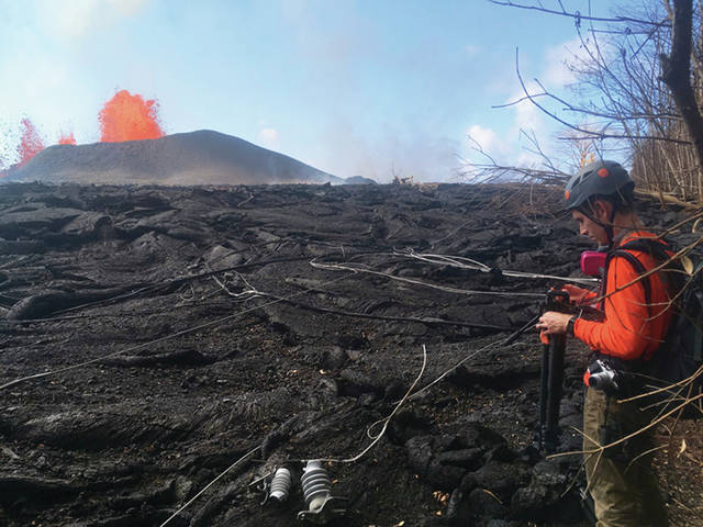 U.S. Geological Survey via AP A Hawaiian Volcano Observatory scientist measures fountain height and takes high-resolution video Friday to determine whether the volume of material exiting fissure 8, located in Leilani Estates, has changed.