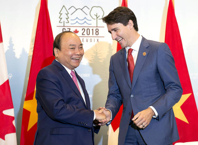 Prime Minister Justin Trudeau, right, meets with the Prime Minister of Vietnam, Nguyen Xuan Phuc, during a bilateral meeting Sunday as part of the G-7 meeting. (Jacques Boissinot/The Canadian Press via AP)