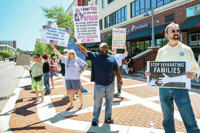 People line up to protest U.S. Attorney General Jeff Sessions and immigration reform on Thursday at Parkview Field in Fort Wayne, Ind. (Mike Moore/The Journal-Gazette via AP)