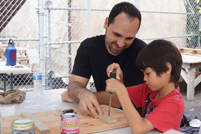 Caleb Milliken, left, holds a board steady while his son, Samsen, assembles a grill utensil rack at an event hosted Saturday by Habitat for Humanity Hawaii Island in partnership with the Hawaii State Commission on Fatherhood. (Cameron Miculka/West Hawaii Today).