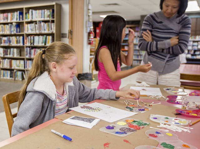Sofya Helms, 11, works on a painting of E.B. from the movie “Hop” on June 13 during Pointillism Painting for Children at Hilo Public Library.