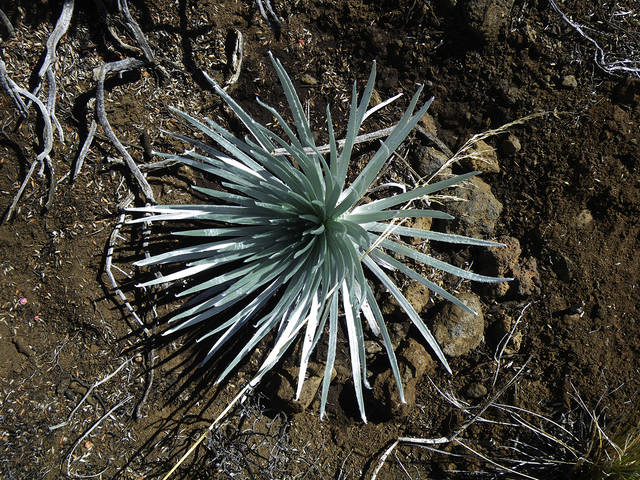 With its fleshy leaves, the silversword can live from three to more than 90 years. It flowers once, sending up a long stalk, and then dies.
