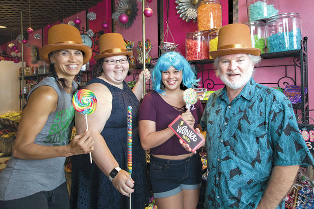 Photo by JEFFREY NORTH WILSON Choreographer Kea Kapahua, director Rachel Klein, vocal coach Rachel Edwards and music director Walter Greenwood get in the “Willy Wonka” spirit with copious amounts of candy.