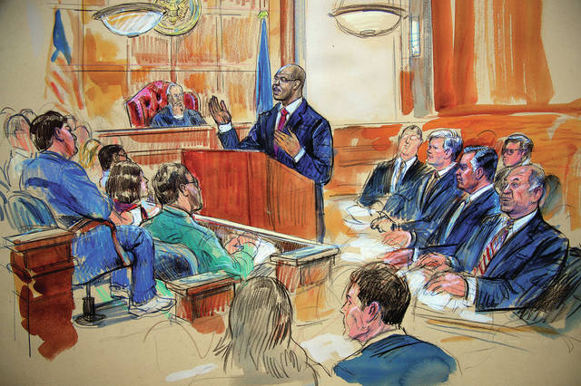 This courtroom sketch depicts Paul Manafort, seated right row second from right, together with his lawyers, the jury, seated left, and the U.S. District Court Judge T.S. Ellis III, back center, listening to Assistant U.S. Attorney Uzo Asonye, standing, during opening arguments in the trial of President Donald Trump's former campaign chairman Manafort's on tax evasion and bank fraud charges. (Dana Verkouteren via AP)