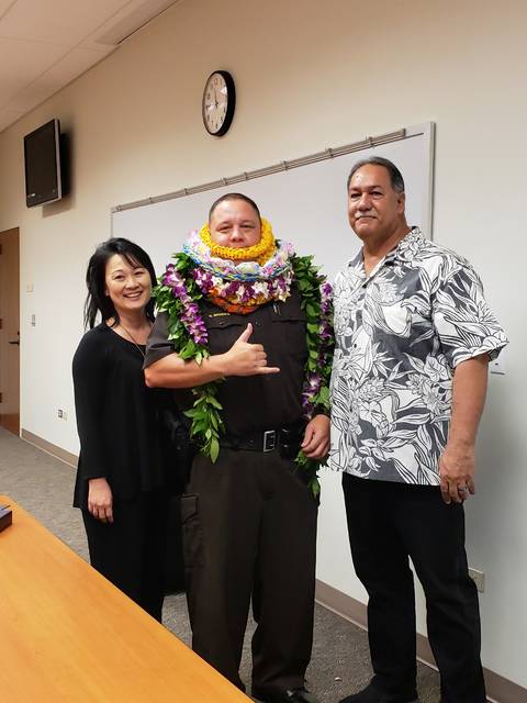 State Sheriff’s Deputy Norman Brown of Hilo was recently promoted to sergeant. Brown, center, was honored at a pinning ceremony Wednesday, with his new badge and certificate of promotion, by Department of Public Safety Deputy Director for Law Enforcement Renee Sonobe Hong, left, and Sheriff Al Cummings, right.
