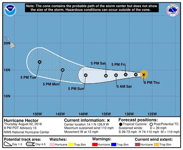 As of Thursday, Hector was a category 2 hurricane with maximum sustained winds of 110 mph. It was moving west at 13 mph. It’s forecast to become a major hurricane (category 3 or greater) by Saturday.