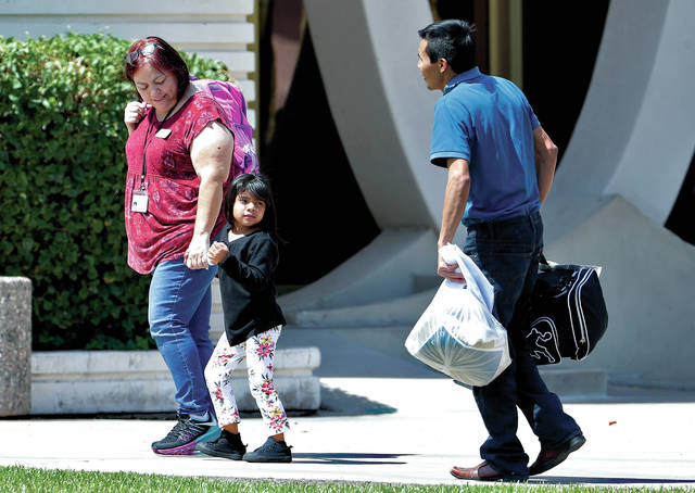 FILE - In this July 26, 2018, file photo, a child holds the hand of a Lutheran Social Services worker as she looks back to a man as they arrive at Lutheran Social Services in Phoenix. The Trump administration and the American Civil Liberties Union are proposing widely divergent plans on how to reunite hundreds of children with their deported parents after being separated at the U.S.-Mexico border. (AP Photo/Matt York, file)