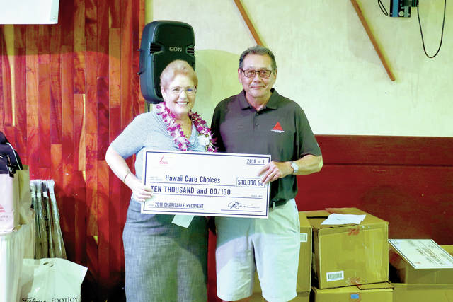 Pyramid Insurance recently had its third annual golf tournament on Oahu for charitable organizations. Hawaii Care Choices of Hilo was a beneficiary of this event and received $10,000 from Pyramid. Accepting the check from Ernest Fukeda Jr., COO of Pyramid Insurance, is Brenda Ho, CEO of Hawaii Care Choices.