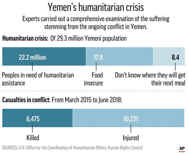 GENEVA — U.N. human rights experts said Tuesday the governments of Yemen, the United Arab Emirates and Saudi Arabia might have been responsible for war crimes since Yemen’s conflict intensified 3 1/2 years ago, including rape, torture, arbitrary detention and use of child soldiers.