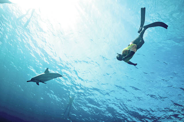 John Kowtiz/Courtesy Photo A diver descends with dolphins during the Hawaii Cup at Honaunau Bay.