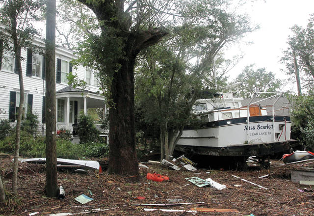 A boat rests in front of a damaged home from tropical storm Florence in New Bern, N.C. (Gray Whitley/Sun Journal via AP)
