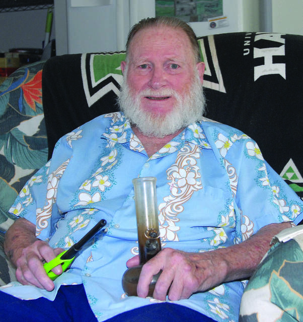 Lanric Hyland smokes his medical marijuana in his home at Ainakea Senior Residences in Kapaau. (Laura Ruminski/West Hawaii Today)