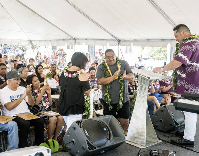 Mayor Harry Kim speaks as Pastor Dion Maeda of Connect Point Church listens Saturday during the Hale Iki Village Grand Opening in Hawaiian Paradise Park.