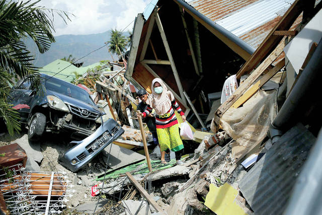 A woman makes her way through the rubble of houses in Balaroa neighborhood in Palu, Central Sulawesi, Indonesia, Tuesday, Oct. 2, 2018. Home to hundreds of families, the neighborhood was once a patchwork of asphalted streets and tidy houses. Now it looks as if it was picked up and thrown back to earth with vicious force. Four days after the earthquake and tsunami hit the Indonesian city of Palu, this devastated neighborhood has received no government help and anger is simmering among its residents. (AP Photo/Dita Alangkara)