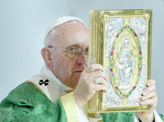 FILE - In this Sunday, Sept. 27, 2015 file photo, Pope Francis holds the Gospel Book during a Mass on the Benjamin Franklin Parkway in Philadelphia. As sex abuse scandals continue to buffet the Roman Catholic Church, Catholics in the U.S. are steadily losing confidence in Pope Francis’ handling of the crisis, according to a new survey by the Pew Research Center, released on Tuesday, Oct. 2, 2018. (AP Photo/Alessandra Tarantino)