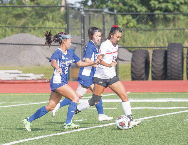 HOLLYN JOHNSON/Tribune-Herald UHH freshman defender Jodi Lillie outraces two Chaminade players during a recent PacWest game.